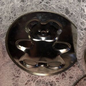Set of silver cake pans. Includes bear and clown designs. Perfect for themed baking. Springform pan.