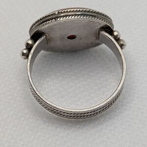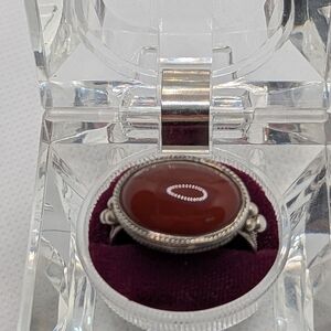 This elegant ring features a stunning carnelian stone set in a classic silver band. Perfect for adding a touch of sophistication to any outfit. 925 silver un stamped but tested.