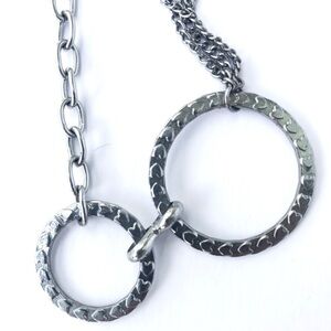 Silver chain necklace with heart patterned circles. Necklace measures 18.5 inches in length.