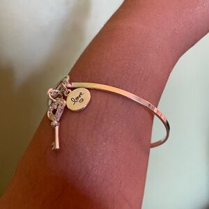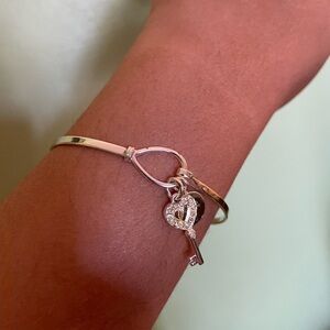Elegant silver charm bracelet featuring a key and heart design. Perfect for adding a touch of sophistication to any outfit.