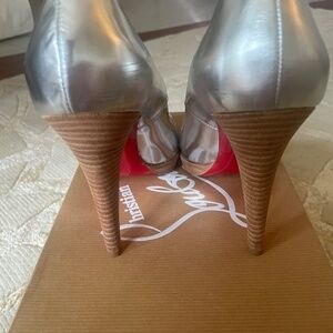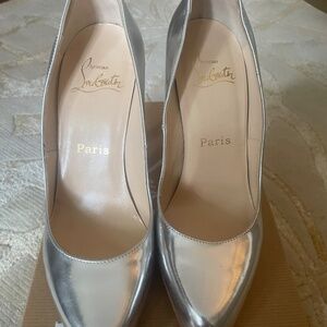 Silver Christian Louboutin heels. Very good used condition. Some scuffing on soles and slight scuffing on inside of heels. Comes with dust bag. Size 37.5, made in Italy. Purchased Holt Renfrew. Smoke-free home.