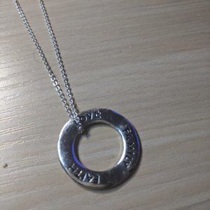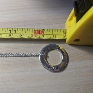 'Circle of Love' Charm Necklace celebrates the love and support that comes from a strong family foundation. Charm is a sterling silver ring, which represents never-ending love, and is engraved with 'Family, Faith, Love'. The 'Circle of Love' charm makes a wonderful gift for Confirmation, First Communion, Mother's Day, or any holiday. Charm is 1.2" around; about the size of a quarter, and slides directly onto a necklace chain, for a modern and simple look. Includes lobster clasp + extender chain.