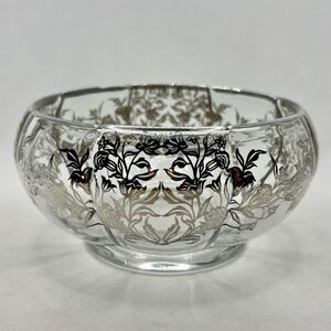 Silver City presents this stunning 6" glass serving bowl featuring a delicate Queen Rose pattern in sterling silver overlay. This Art Deco style piece from the early to mid-20th century exudes elegance and charm, making it a perfect addition to any antique silver collection. Made of high-quality silverplate, this bowl is sure to impress with its timeless beauty and intricate design. Ideal for serving a variety of dishes or as a decorative accent in any home, this Silver City bowl is a must-have for those who appreciate fine craftsmanship and vintage appeal. Circa 1920s. This bowl is in very good preloved condition.