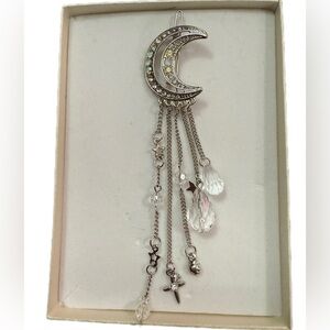 Elegant silver crescent moon hair accessory jewelry clip with sparkling crystal accents. Perfect for adding a touch of celestial charm to any outfit. Fashion hair accessory.
