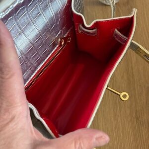 novelty bag, metallic silver, croc embossed, cartoon, statement purse, crossbody, top handle, playful fashion
