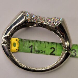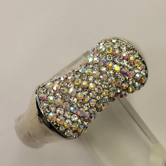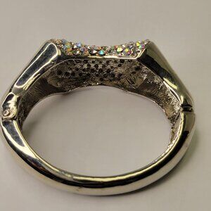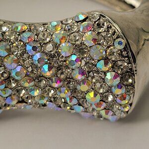 Silver crystal or aurora borealis tone crystals adorn this gorgeous cuff bracelet