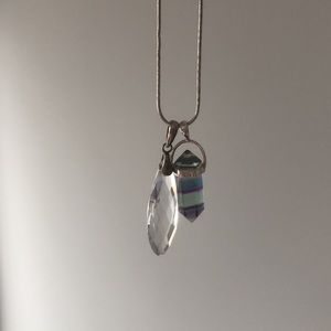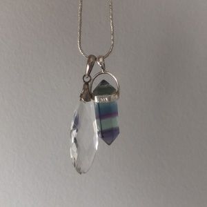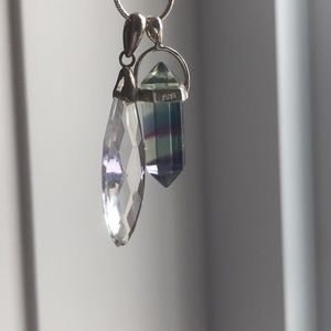 Gorgeous silver crystal pendants. Engraved 925 as pictured above. The darker, colourful crystal measures about 1 inch, and the clear crystal measures about 1.5 inches. In great condition. One chain is included.