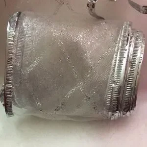 Elegant silver decorative ribbon with a shimmering finish. Perfect for crafts and gift wrapping.