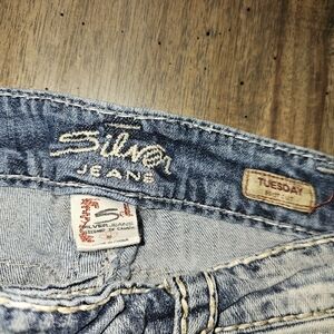 size 30. distressed ripped look, has lace sewn under the rips. has a black spot in the front