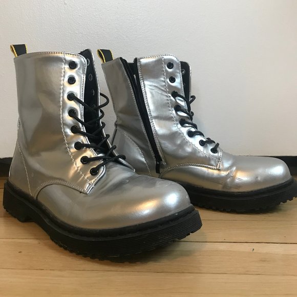 Super reflective silver pleather, with zipper on side. There are very very light scuff marks around toe but otherwise very lightly worn.