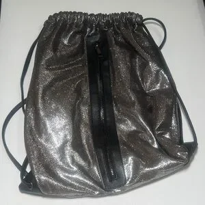 Shimmering silver drawstring backpack with front zipper pocket. Stylish and functional.