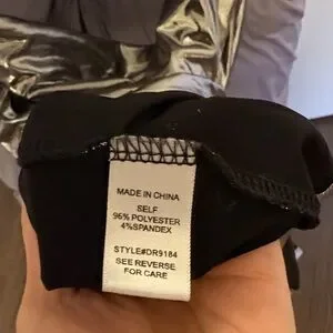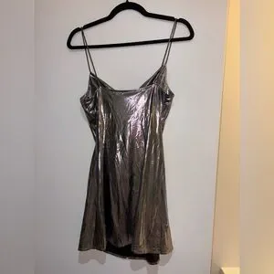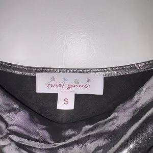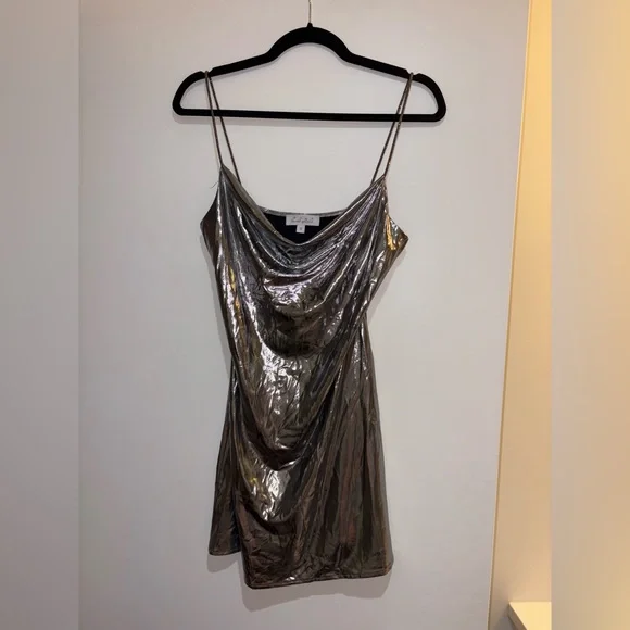 Shiny silver short dress with a cowl neckline and bedazzled straps. Tagged size small and true to size. Purchased at a boutique store and the brand is ‘sweet generis.’ Worn once at the eras tour and has sat in my closet ever since. Currently wrinkled but nothing a good steam or iron can’t fix. Would be a great dress for the holiday season!