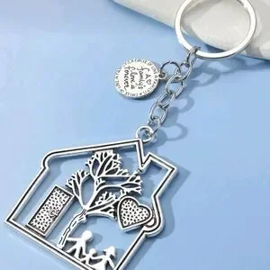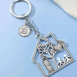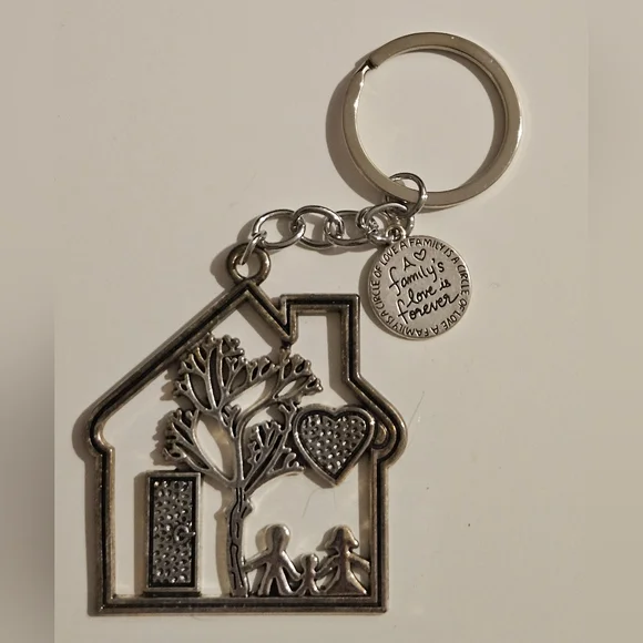 Charming silver keychain with a family tree design. Features a heart and family figures. Perfect for keeping keys organized.