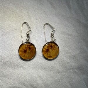 Silver, FloralMinimalist Dangle Earrings with Amber Glass Pendants