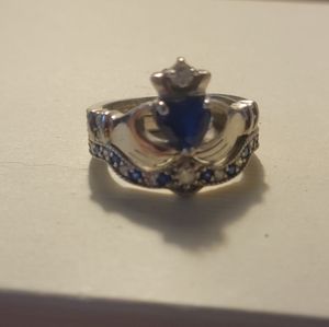 This beautiful two-piece claddaugh set is a perfect gift for a friend, daughter, mother, sister, or significant other. It is sized at about a 5, and pieces can be worn together or separately. The blue and white cz stones give this ring a rich and unique look.