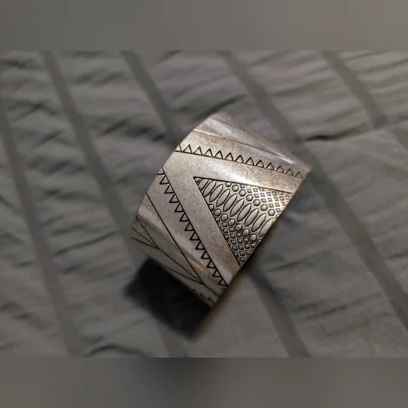 Elevate your style with this silver cuff bracelet featuring a striking geometric pattern. Perfect for any occasion.