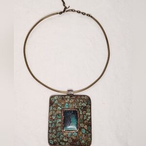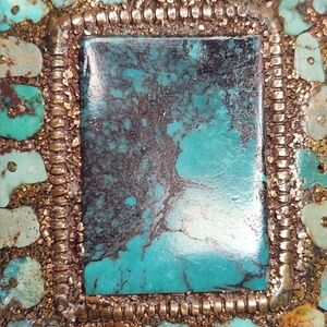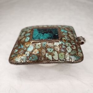 Large Rectanglar Genuine Silver & Gold Tibetan prayer pendant with genuine Turquoise center stone surrounded by a mosaic of pieces of turquoise and Granulated Gold with Ornate Silver Setting and Bail.