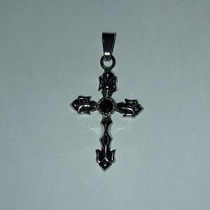 This strong silver cross showcases a gothic-inspired design with intricate detailing and black centre stone. Perfect for adding a touch of sophistication to any accessory collection, this piece is both timeless and versatile.