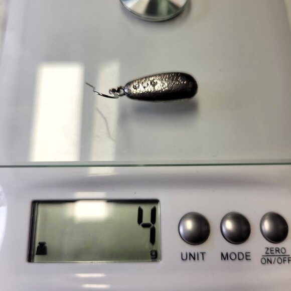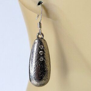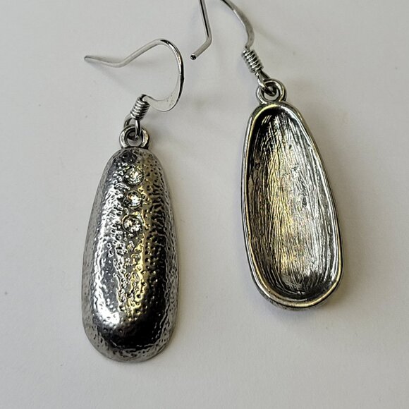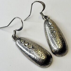 With a smooth and a subtle simple hammered-like pattern. With 3 tiny crystals embedded on it.