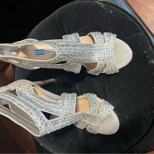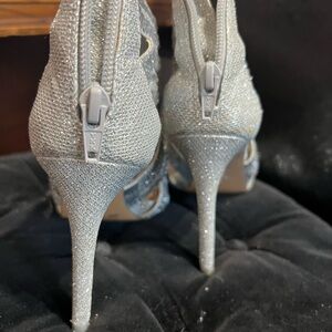 These silver heels feature an open-toe design and a high heel, perfect for adding elegance to any formal occasion. The intricate straps across the front are crafted from a textured woven material, enhancing their sophisticated look. Ideal for making a statement, these shoes combine style and comfort effortlessly.