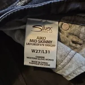 Silver brand jeans. Aiko, skinny, mid rise. waist size 27, length 31. good condition.