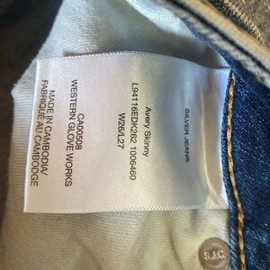 These Silver Jeans feature a sleek skinny fit in a classic blue hue, enhanced by stylish distressing for a modern, lived-in look. The denim showcases a subtle fading pattern, adding character and depth to the overall design. Perfect for casual outings, these jeans offer both comfort and a trendy aesthetic.
