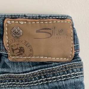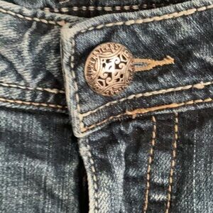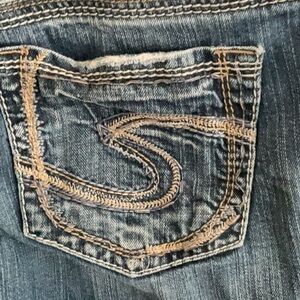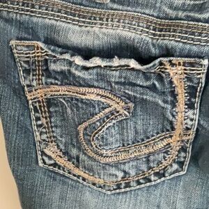 Experience the timeless appeal of Silver Jeans with these blue boot cut denim pants. Crafted with a medium-to-dark wash, they feature a classic boot cut silhouette that complements any casual look. The jeans showcase a vintage-inspired design with natural fading and whiskering effects, offering both style and comfort. Worn with marks.length on jean tag says 31 but my measurements are at 28