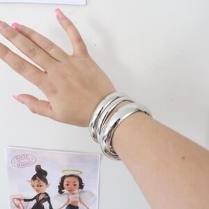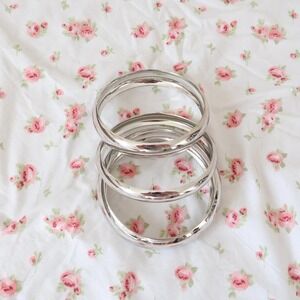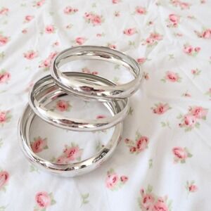 Super bold chunky set of three polished silver-tone bangle bracelets. Designed to be worn stacked together for a high-impact reflective Y2K glam look. Brand is Unbranded.