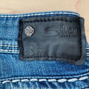 Item keywords: Women's jeans, denim pants, casual jeans, blue denim, straight leg, Silver Jeans Co., stylish jeans, everyday wear, intricate stitching, button closure, zip closure, front pockets, back pockets, country, urban western, casual streetwear, feminine sexy jeans, flattering bodycon cowgirl jeans.