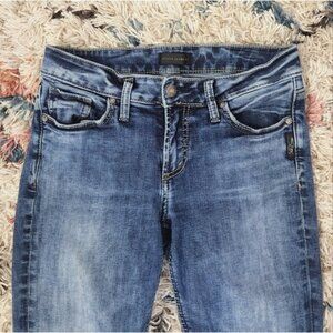 Silver Jeans Elyse Mid Rise Skinny jean in a medium acid wash. Lots of stretch.