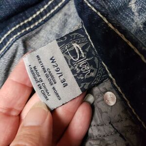 Silver Suki bootcut jeans, have been cropped so check the inseam. Gorgeous bling pockets on front and back. whiskering and fading throughout.