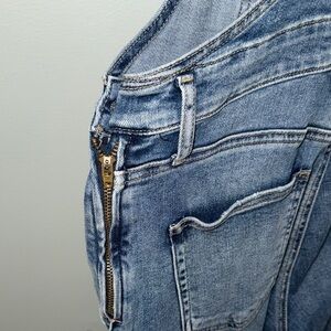 Stylish blue denim overalls. Features adjustable straps and front pocket. Distressed knee