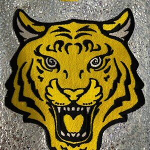 Juicy Couture silver bomber jacket. Black Label. Awesome tiger-themed embroidery. In very good condition, nicely lined. Elasticized waist and trim. The only slight flaw to note (and not sure it's even a flaw) is that, because the silver is crinkled in texture, there are a few areas that seem ever so slightly more "bald" than others. You'd have to look really closely and this in no way detracts from the jacket's opulence. Fabulous for year-round wear, easy to dress up or down. See pics for measurements. 85% cotton and 15% polyester (outer shell). Classic J on the zip. Marked size XS, could fit up to a medium depending on desired fit. (Model is 5'5" and size L.)