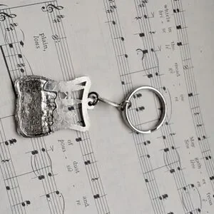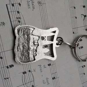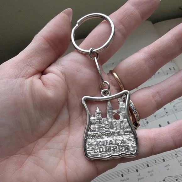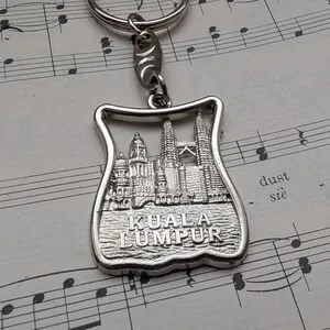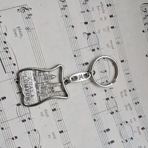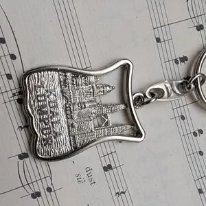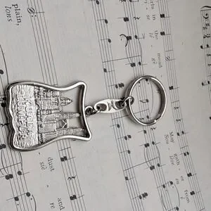 Elegant silver keychain featuring a detailed cityscape design. Perfect for adding a touch of sophistication to your keys.