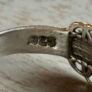 This elegant silver ring features a delicate lace pattern, stamped 925 Sterling Silver. It has a natural, hand-made appearance with a darkened silver finish.