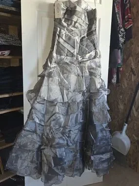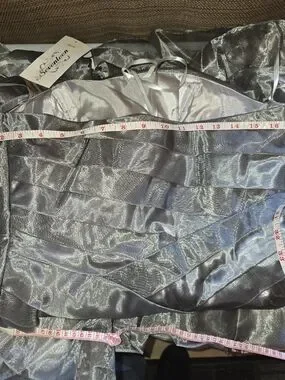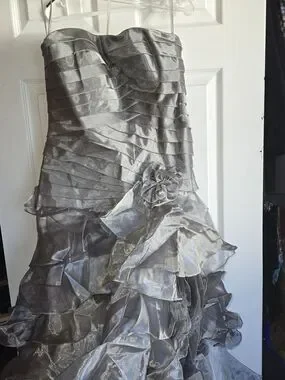Silver organza and satin layered prom gown. Dramatic cascading ruffles create movement. Rosette accent at the hip for feminine detail. Smooth satin inner lining. Striking metallic sheen for formal events.