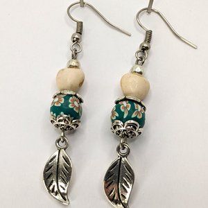 Silver Leaf with Stone heart Bead Earrings