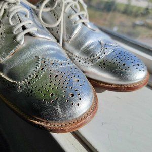 Silver oxfords with eyelet detailing from Banana Republic. Leather uppers. Some scuffs on toes and heels (as per photos) but in great shape. Very comfortable and on-trend with the metallic color!