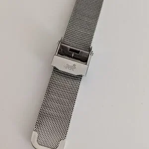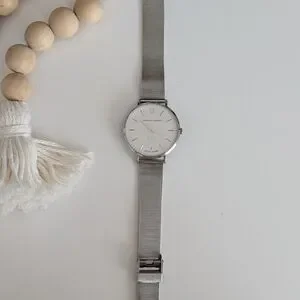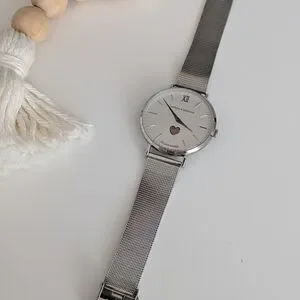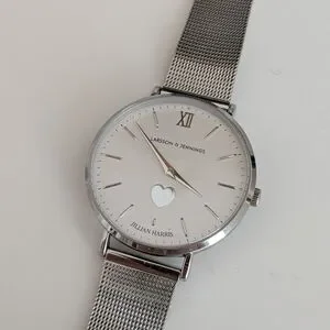 Elegant silver watch with a sleek mesh strap, perfect for any occasion. Has signature Jillian Harris heart. Needs a battery.