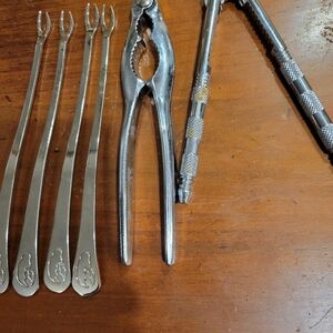 Elegant silver metal 6 piece seafood lobster crab crackers and pick set, perfect for any kitchen. Durable and stylish design.