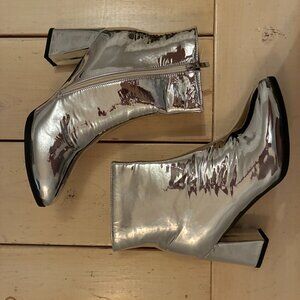 Sleek silver mirror finish ankle boots with a modern metallic shine.