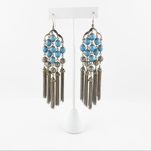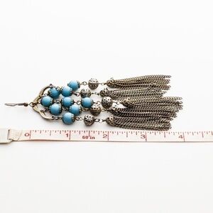 Long beaded tassel chandelier drop earrings. Silver tone alloy metal with hook for pierced ears. Designed with light blue plastic beads, filigree beads and metal tassel chains. Unmarked, pre-owned with normal wear, not noticeable. Please refer to photos.