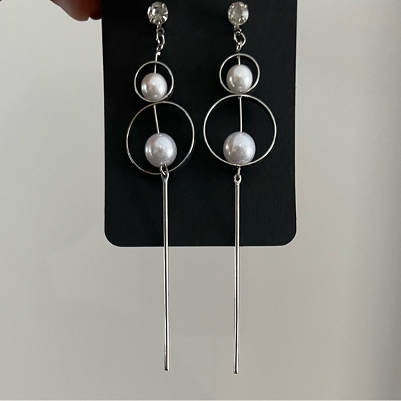 Beautiful set of vintage modern style, drop earrings. 4.5" long, Large circle 1" wide, small circle .5" wide stone measures 4mm x 4mm set in a four prong setting. Stud earring set, minimal to no visible wear, all rhinestones in tact - In great pre-owned condition, un marked metal