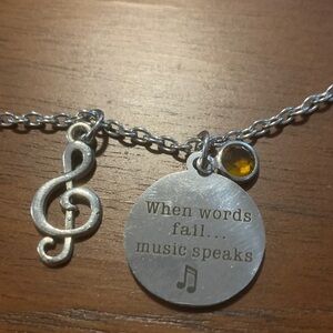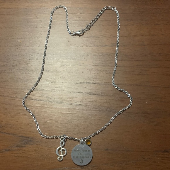 Elegant silver necklace featuring a musical note,orange rhinestone and a circle pendant. And a penPerfect for music lovers.
