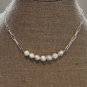 Silver Paperclip Pearl Necklace 16.5”+2”