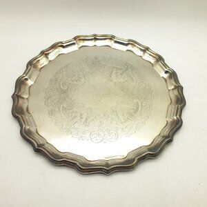 A vintage tea service including a teapot, sugar bowl and creamer along with a platter. They have different makers. The teapot has a ribbed design, an engraved "R" and is stamped "Victorian Plate," which was a trademark of Lipman-Levinster which operated in Canada in the 1920s and 30s. The platter is marked "Primrose Plate" which is a name used by Birks in Montreal. The platter has some wear and its base metal is brass. The sugar bowl and creamer are a matching pair and are decorated with floral designs on their handles and feet.