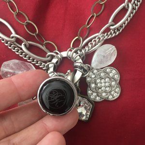 Dyrberg Kern is # 1 costume jewelry designer in Europe. This is silver plated necklace with multi-pendants. Swarowski crystals. Can be worn as a short or long necklace.