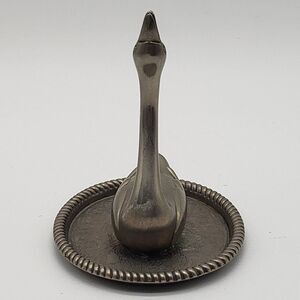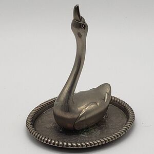 -Beautiful vintage swan ring holder and trinket dish made of silver plated metal; moulded swan sitting on a textured floral and rope style oval trinket tray