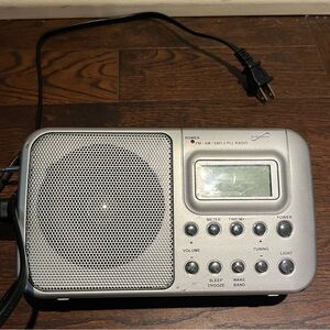 Enjoy your favorite stations with the sleek silver portable FM/AM radio. Perfect for on-the-go listening.
