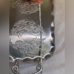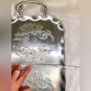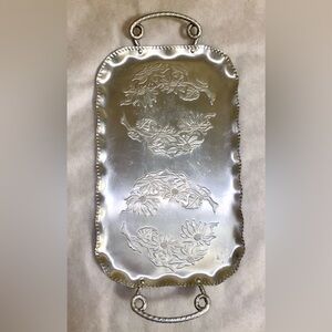 Elegant silver serving tray with intricate floral engravings. Features two sturdy handles for easy carrying.